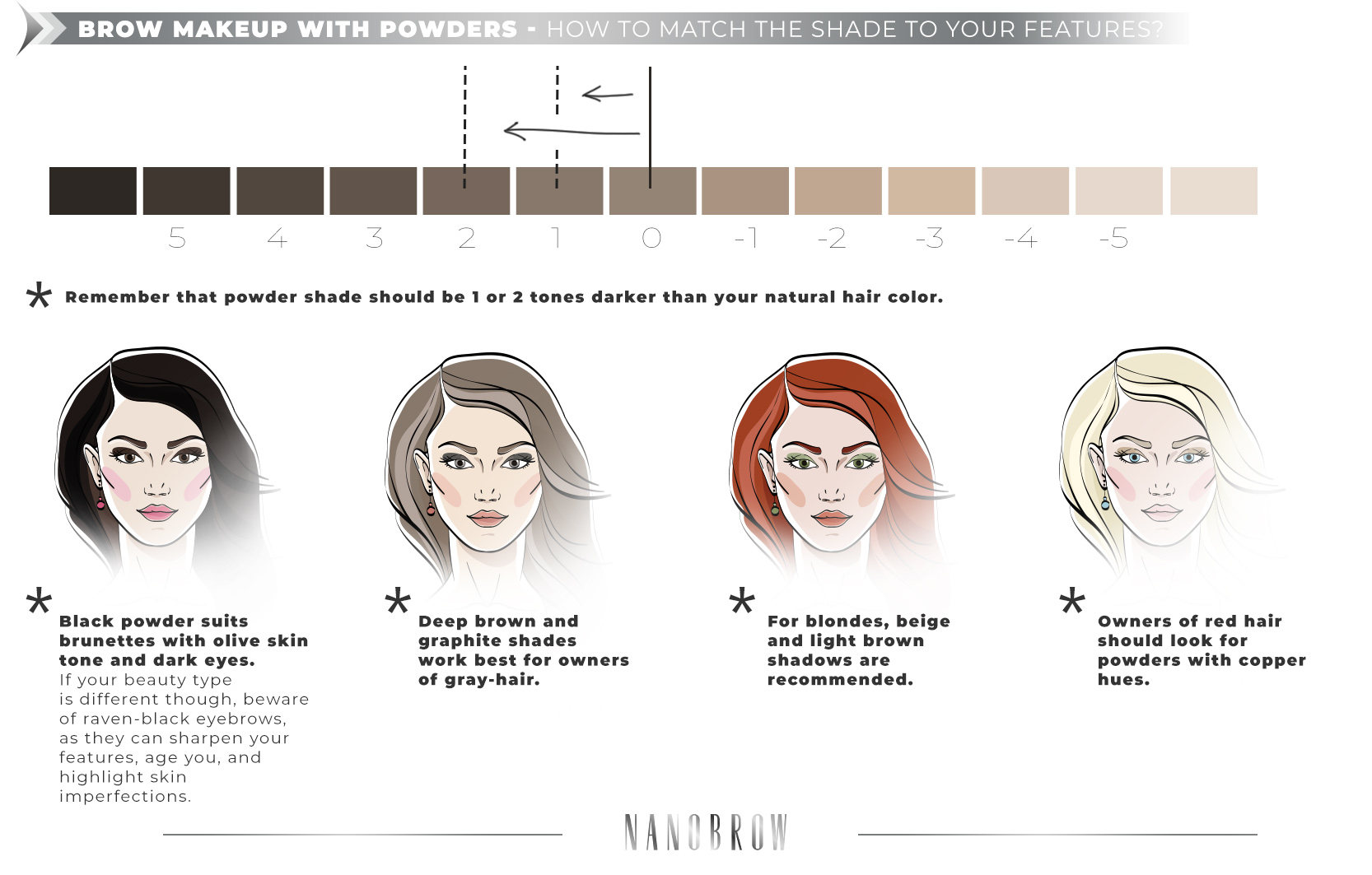 Brow powders are the perfect solution for subtle and non-overdrawn eyebrow makeup. Doing your makeup with powders ensures the perfect shape of your arches, while gently emphasizing and defining them. The texture of the powders allows for easy touch-ups in case of any imperfections. Brow makeup using powders ensures your face maintains perfect proportions and highlights your features. The most important thing is to choose the best brow makeup kit. It must contain natural-looking shades and deliver long-wear effects. It should come with built-in wax or highlighter with soft formula and satin powders with excellent pigmentation. That's exactly what Nanobrow Eyebrow Powder Kit is. It's a great palette for brow makeup, recommended for both professional and home use.